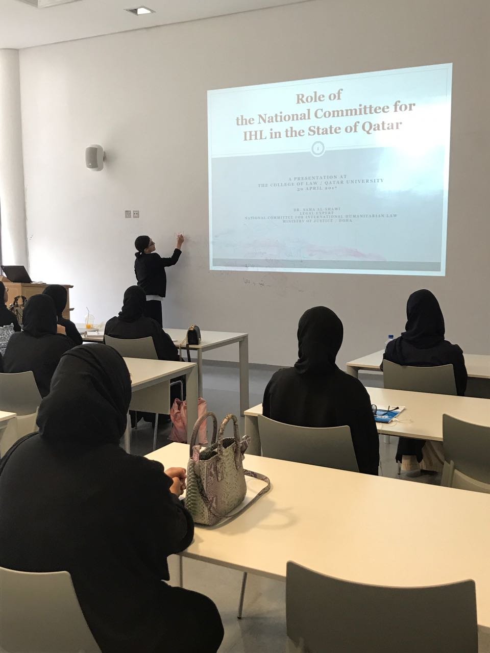 في 30/4/2017، وفي إطار نظام المُحاضر الزائر الذي تتبناهُ كلية القانون / جامعة قطر، قدّمت اللجنة الوطنية للقانون الدولي الإنساني محاضرة في كلية القانون – بنات وذلك تحت عنوان: دور اللجنة الوطنية للقانون الدولي الإنساني في دولة قطر.